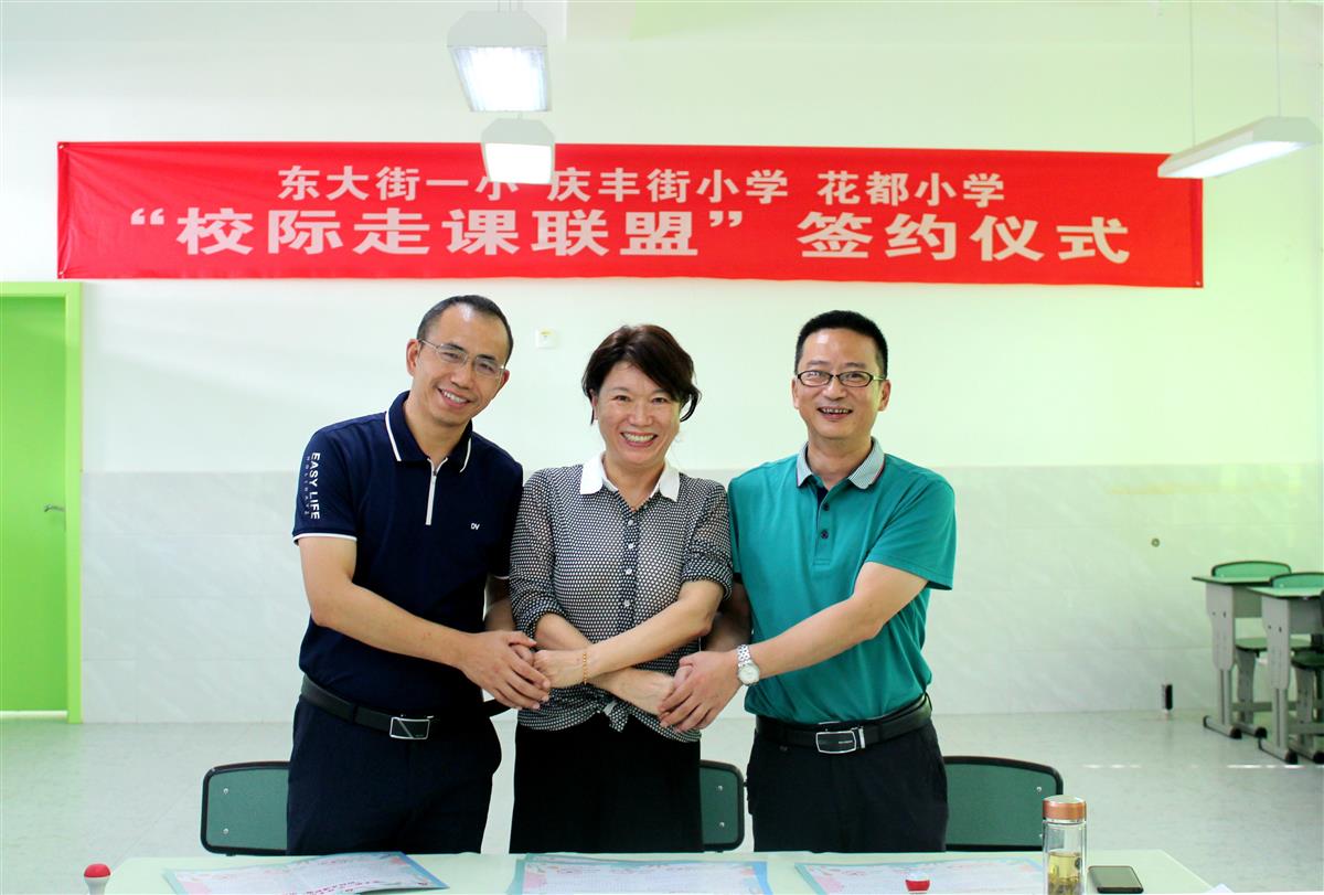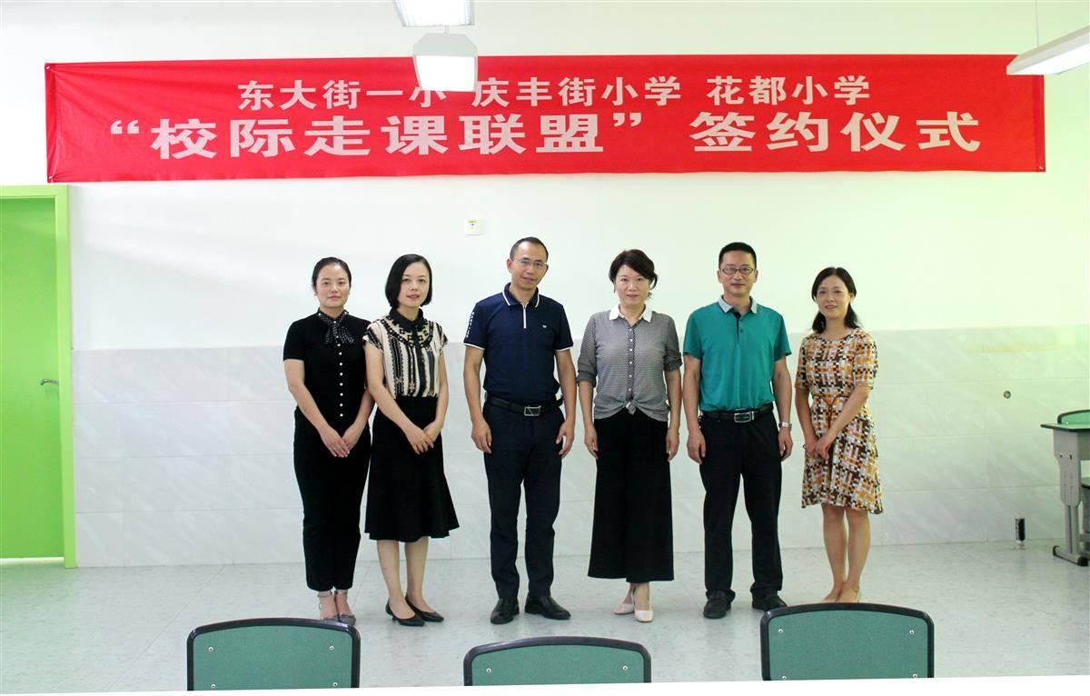 2020年8月27日,成都市温江区百年名校东大街一小、庆丰街小学与花都小学签订协议,成功成立“校际走课联盟”。从即日起,花都小学将在未来五年内,依托名校优质教育资源,加强学校间教学融通、教研联动、教师交流,推动三校学校教育教学相互学习、共同提高,促进区域教育均衡发展。成都市温江区东大街一小校长鄢光文、成都市温江区庆丰街小学校长张春田、启航彩长刘秀荣带领学校领导班子参加签约仪式并亲自签下了三校五年的合作协议书。