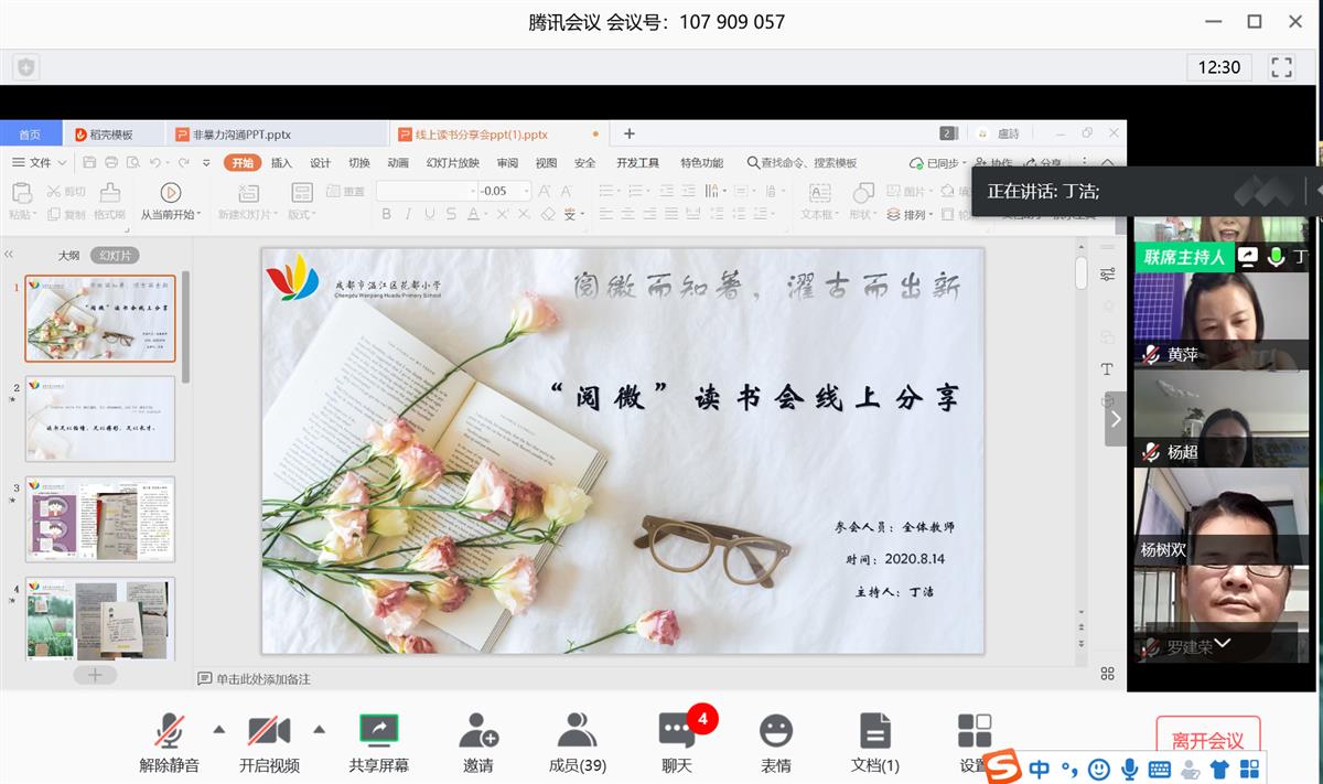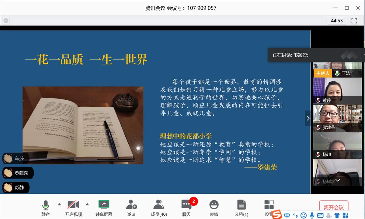 在暑假期间,虽不能相聚校园,但花都小学的全体教师从未停止过阅读的脚步,因为我们深知:读书是教师最崇高的职业素养,是最美丽的人生习惯,是最发自内心的精神需要,亦是教育最靓丽的一道风景。为了让老师们在读书交流中启迪智慧,分享馨香。2020年8月14日下午16时,花都小学全体教师开启了线上读书交流研讨活动,共同分享“悦读”的收获。