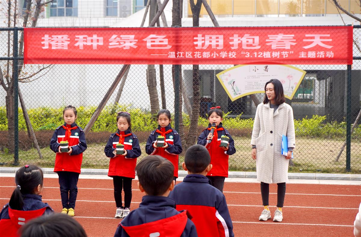 伴随着全校师生齐诵经典的朗朗童声,认领活动开始了。花都小学少先队辅导员张利珺老师宣读了《花都小学植树节倡议书》,号召孩子们护绿、爱绿;护校,爱校,在生活中学习基本的劳动技能,在家长的支持下,掌握基本的培育方法,认真培育好绿植,做好护理记录,积极参与科学、语文学科开展的系列培育、观察活动,像对待朋友一样对待自己的绿植小伙伴。她寄语花都学生要像爱护自己一样养护好佛甲草,在成长的过程中要像佛甲草一样顽强,对未来充满渴望,充满勃勃朝气。学期末,学校将对每位小朋友的绿植培育情况进行评比、表彰。