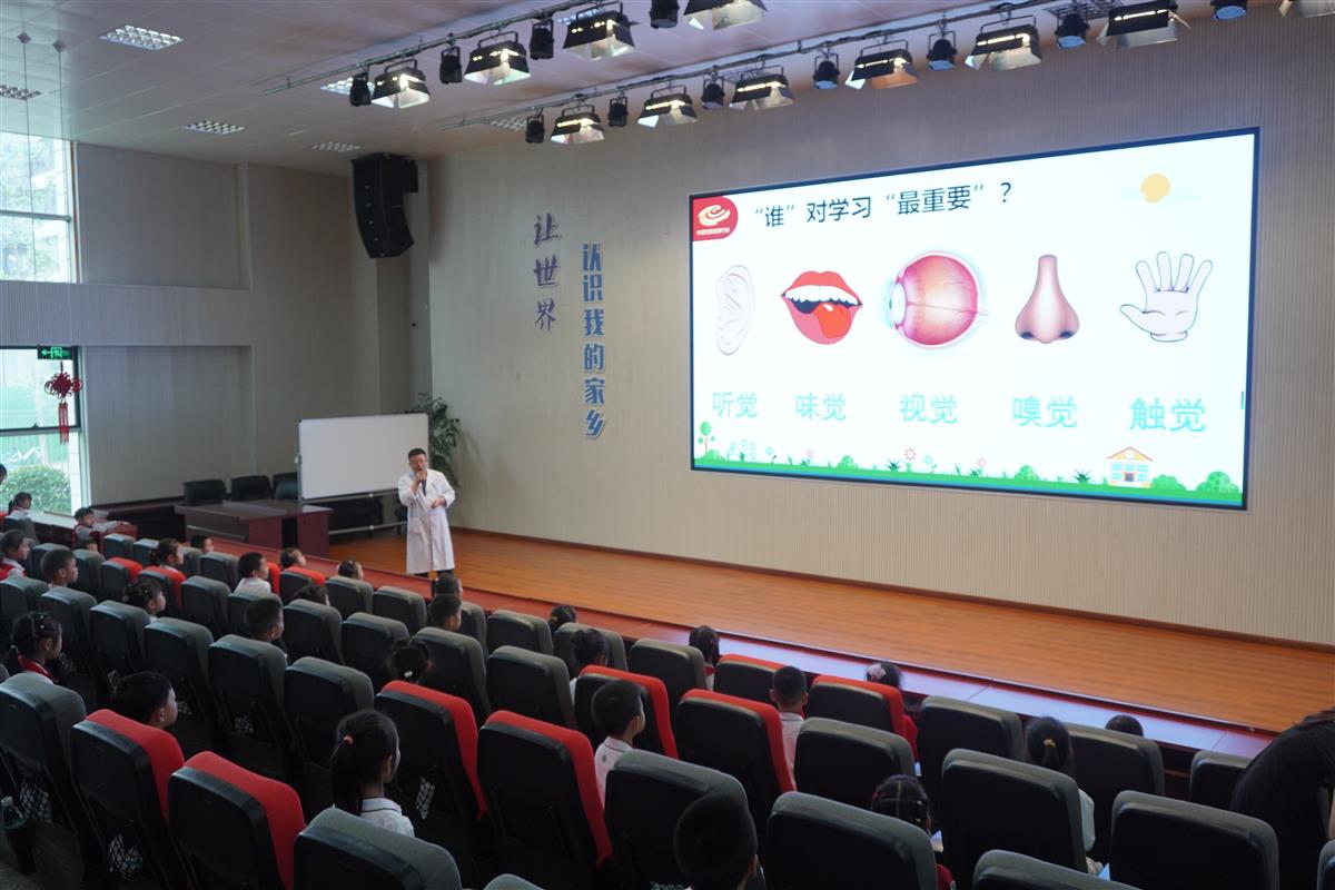 6月9日下午,温江区公平街道社区卫生服务中心眼科的刘波医生走进花都校园,为孩子们开展了一堂内容丰富、意义深远的爱眼、护眼讲座。刘医生从产生近视的原因、治疗和预防近视等方面做了详细的讲解,重点对护眼基本常识开展了互动体验式教学,旨在培养学生养成良好的用眼习惯,他还号召同学们积极行动起来,认真做好眼睛保健操,保护视力珍爱光明。