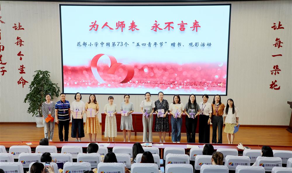 2022年5月7日,星期五。利用周前会时间,花都小学隆重开展了主题为“为人师表 永不言弃”的中国第73个“五四”青年节赠书、观影活动。本次活动由花都小学第四党小组承办,花都小学党员教师、教师发展中心主任刘瑶主持活动。花都小学党支部书记、校长刘秀荣为青年教师赠送专业书籍,并亲自推荐青年教师观看优秀教育影片——《嗝嗝老师》,作为“五四”青年节专场观影影片。