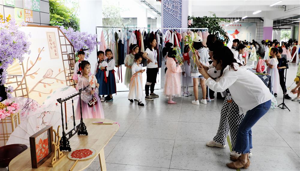 “风吹仙袂飘飘举,犹似霓裳羽衣曲”,一排排精美的汉服,带你穿越时空,形成一副古风画卷。孩子们身穿汉服体验,重现华服之美,传承千年中华文化。有的孩子手执纸扇,身姿挺拔,有的孩子活泼可爱。