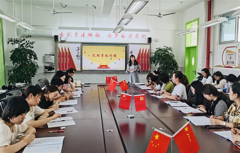 刘媛老师结合自身实际案例,分享了在班主任工作中,如何“有滋味”地叫孩子们的名字,如何让语言成为火把照亮孩子迷茫的心灵,在平凡的班主任点滴工作中品出滋味。大队辅导员钟雪莹老师就本月班主任常规工作进行了总结,并详细安排了成都市新时代好少年的评选活动,对分批入队和红领巾奖章实施办法进行了再次说明。 分管德育副校长范校长对上台分享的老师给予高度赞扬和鼓励,并希望老师们做一个“站在巨人的肩膀上看世界”的爱读书的班主任老师,不断充实自身的专业知识,升华情操,提高综合素质。同时,结合疫情防控、校园安全、班级管理等方面的工作进行了强调和进一步的指导。