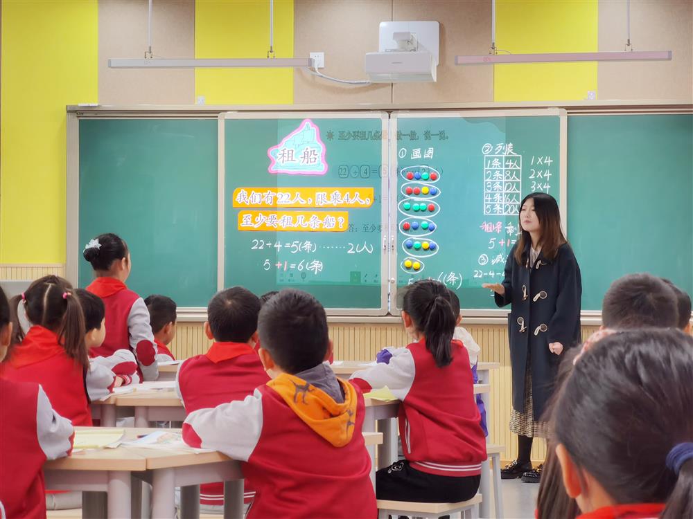 万雪老师从租船的生活情景出发,让学生自学在情境中发现信息并提出问题,针对信息和问题中的关键词“限乘”、“至少”,提出关键问题帮助学生理解突破。在问题的解决中,给学生留足思考时间,让学生利用画图、列表等多样化的策略探索,在合学中展现数学的思维,群学中明确同一个问题可以有不同的解决方法,在应用中激发学生的学习兴趣,让学生感受除法与生活的密切联系。