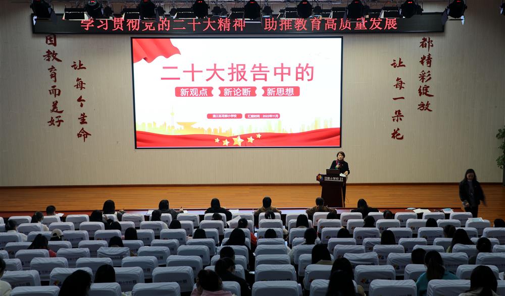2022年11月25日,温江区花都小学校组织全体教职员工学习党的二十大精神。会议由党支部书记、校长刘秀荣主持,全体党员以及教师参加。刘秀荣书记以《学习贯彻党的二十大精神 助推教育高质量发展》为题作专题发言,带领全体教师回顾党的二十大报告中与教育有关的论述,重点解读了报告中关于教育的新思想、新战略、新要求。