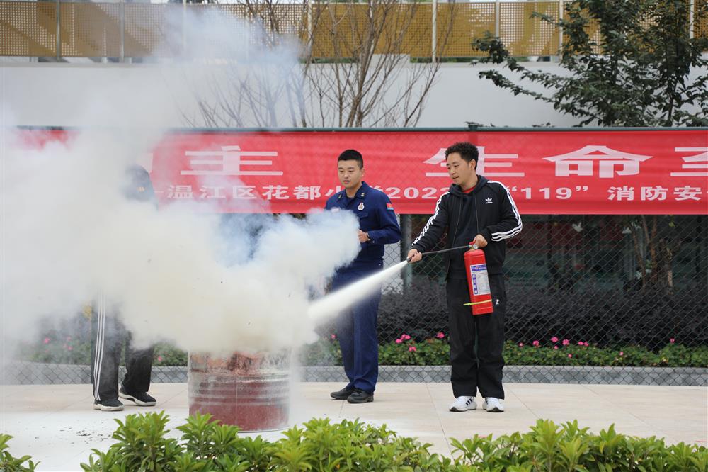 温江区消防队消防员向全体师生讲解火灾逃生知识与技巧,仔细、全面地展示了各种各样的消防器械,讲解每一个消防器械的用途,并让师生们亲身体验,教会大家在遇见火灾时该如何应对和使用这些器械。学校老师和安保人员、保洁阿姨都亲身体验了使用安全器材灭火的基本技能,开展了一次生动的现场培训。