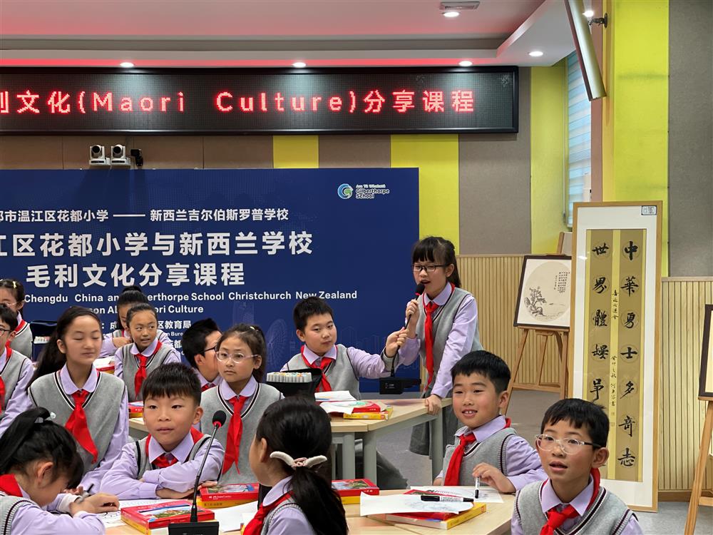 2023年12月12日,温江区花都小学校与新西兰吉尔伯斯罗普学校的孩子们再次相约线上。这一次,由新西兰吉尔伯斯罗普学校的孩子们向花都小学的孩子们介绍了新西兰动物、植物和城市代表等多元文化特色并一起绘制了代表毛利文化的图腾。