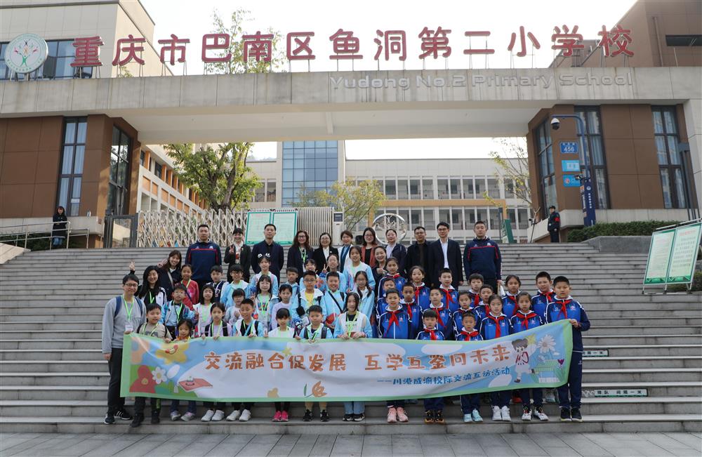 2024年3月22日上午,香港仁济医院罗陈楚思小学、成都市温江区花都小学、成都市温江区东大街第一小学师生一行50余人来到成渝双城经济圈结对友好学校——重庆市巴南区鱼洞第二小学龙泽路校区交流学习。香港仁济医院罗陈楚思小学校长陈嘉碧女士,成都市温江区花都小学党支部书记、校长刘秀荣,成都市温江区东大街第一小学管理服务中心副主任梁念,重庆市巴南区鱼洞二小党委书记刘玉霞、重庆市巴南区鱼洞二小党委副书记、校长舒马鹰,重庆市巴南区鱼洞二小龙泽路校区校长苏雁等一起参加了此次活动。
