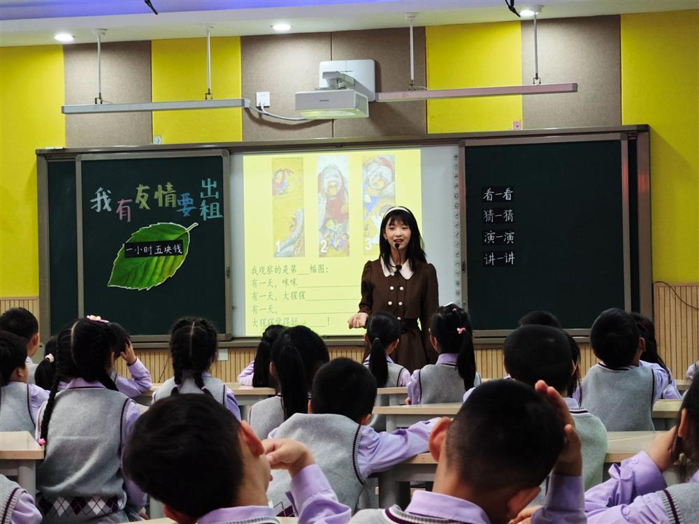 任思维老师执教绘本《我有友情要出租》一课。任老师以欢快的歌曲《找朋友》开场,引出话题,接着,引导孩子们观察封面,围绕书名大胆质疑,从封面中寻找关键信息,激发阅读兴趣,唤醒阅读期待,一步步引导孩子们随着故事情节去猜想。课堂上,孩子们高兴着、惊奇着、喜悦着、感动着,时而倾听,时而交流,时而猜测推想,时而思考感悟……他们渐渐明白:朋友是要去找寻的,而且,他们就在你身边,等着你去发现。