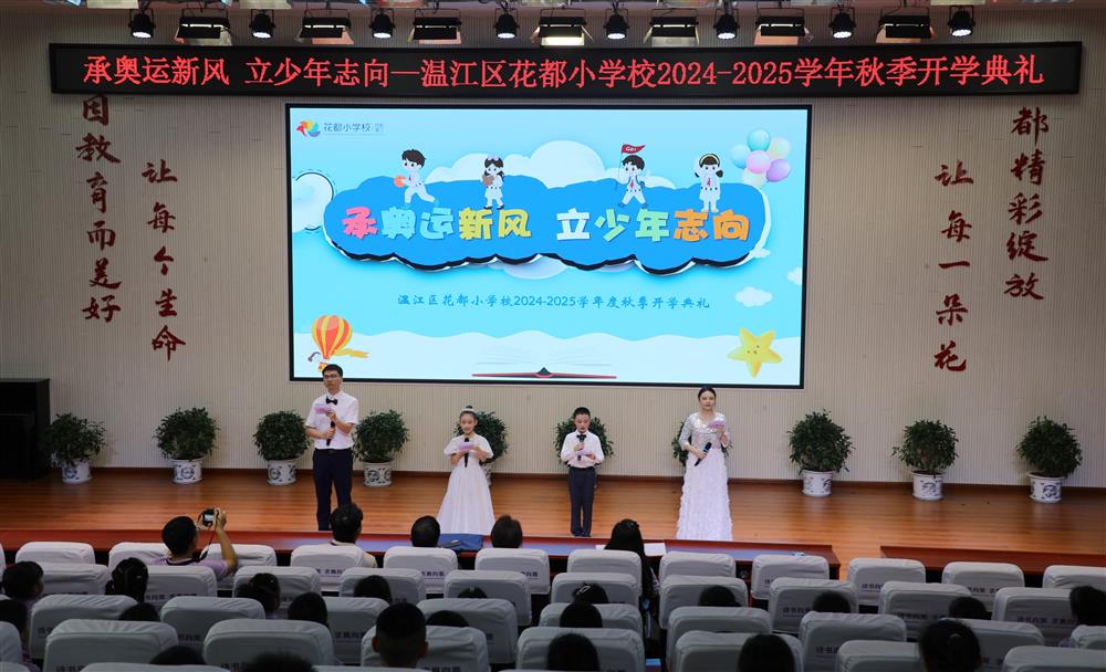 2024年9月2日,主题为“承奥运新风 立少年志向”的启航彩2024—2025学年度秋季开学典礼隆重举行。为规避高温天气可能带给孩子们的不适,开学典礼分为室外和室内两个部分举行。温江区政府督学李登富、温江区融媒体中心记者、第117任“影子校长”郑希,2023--2024学年度“阅微读书家庭”家长代表和全校师生一起参加了典礼。花都小学党支部书记、校长刘秀荣为开学典礼致辞,并邀请嘉宾们一起为新成立的“花都小学‘111’校园融媒体工作室”授牌,聘请温江区融媒体中心记者郑希为花都校园融媒体工作室暨七色花校园电视台名誉主任,还为2023--2024学年度花都小学“阅微读书家庭”家长代表颁奖。