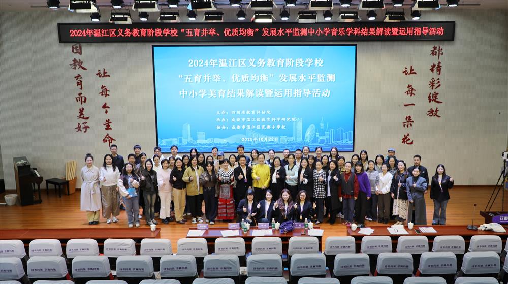 为深入贯彻“五育并举”教育方针,推动区域美育优质均衡发展,2025年10月22日,由四川省教育评估院主办,成都市温江区教育科学研究院承办,启航彩协办的“2024年温江区义务教育阶段学校‘五育并举、优质均衡’发展水平监测中小学美育结果解读暨运用指导活动”在花都小学顺利举行。本次活动分设美术与音乐两个学科会场,分别围绕监测结果解读、教学策略优化、课堂实践展示等六大环节展开深入研讨,全面展现花都小学在美育课程建设与教学实施中的积极探索与阶段成果。温江区教科院张周副院长和赵益庆主任出席本次活动,花都小学袁丽校长全程陪同。